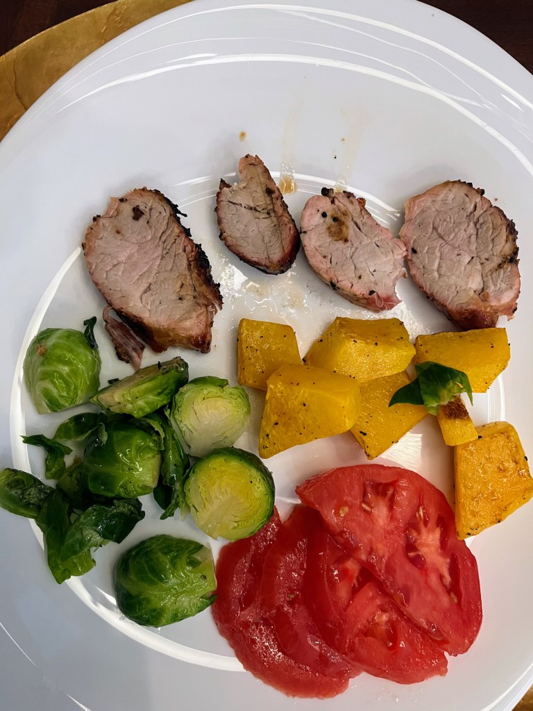 I like to fire up the gas grill on these chilly Jacksonville, Florida evenings. C’mon now, stop laughing. It’s been pretty cold around here and will be down to 24 this weekend. Here, a grill pork tenderloin with roasted butternut squash, Brussel’s sprouts, and sliced tomatoes.